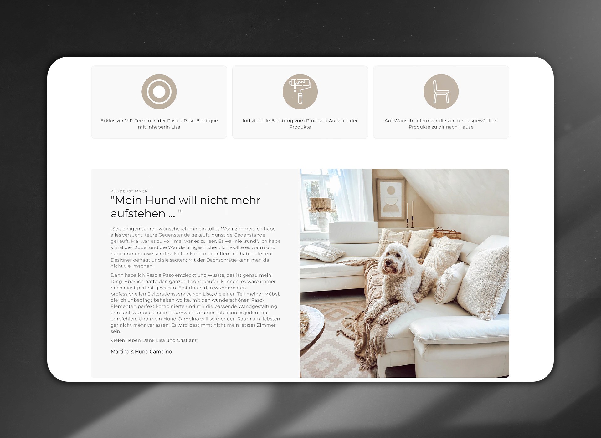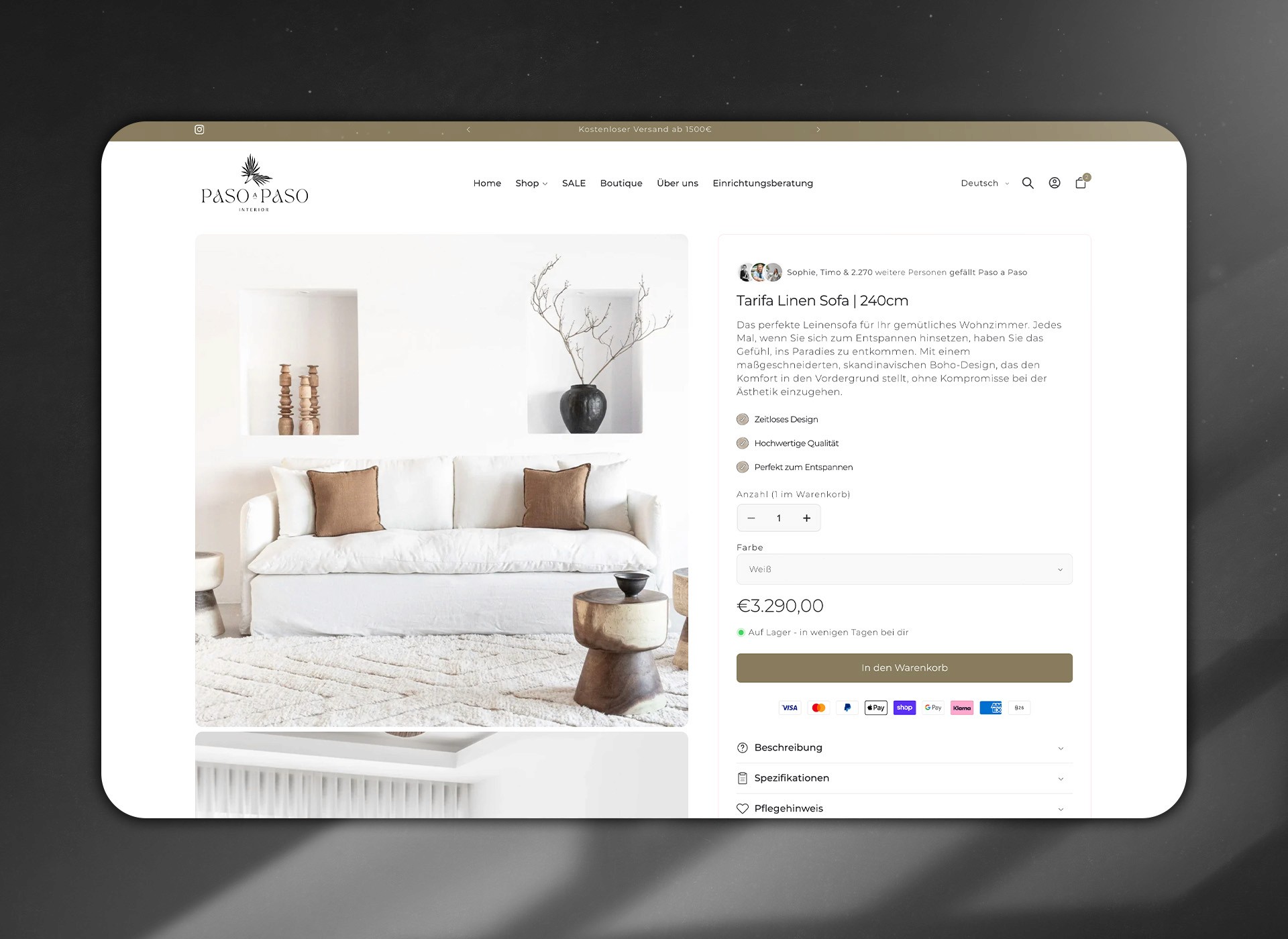 Das Ziel von Paso a Paso war es, eine digitale Bühne für Luxusmöbel und -accessoires zu schaffen, die nicht nur verkauft, sondern inspiriert. Der Shop sollte den hohen Anspruch der Marke widerspiegeln, ein Gefühl von Exklusivität vermitteln und gleichzeitig eine angenehme, intuitive Customer Journey ermöglichen. Jeder Klick sollte sich wie ein Schritt durch eine kuratierte Interior-Ausstellung anfühlen.