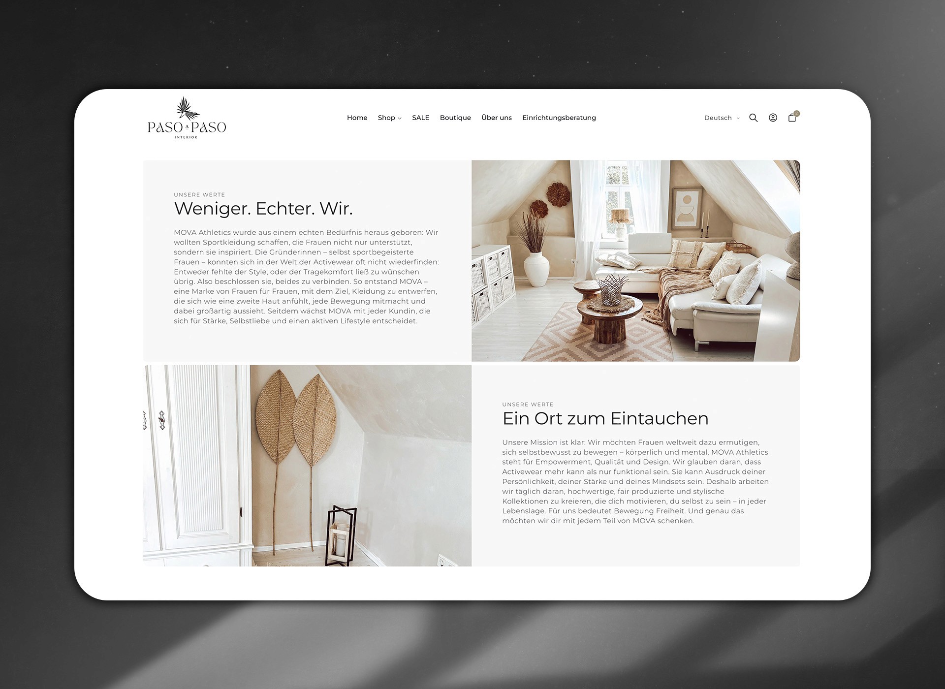 Entstanden ist ein visuell beeindruckender Shopify-Shop, der die Marke Paso a Paso authentisch widerspiegelt: edel, reduziert und hochwertig. Das Design lenkt die Aufmerksamkeit auf die Produkte, während dezente Animationen und smarte Filterfunktionen für ein reibungsloses Nutzererlebnis sorgen. Paso a Paso zeigt, wie sich Interior-Luxus auch online mit Klasse präsentieren lässt – Schritt für Schritt zu stilvoller Wohnkultur.